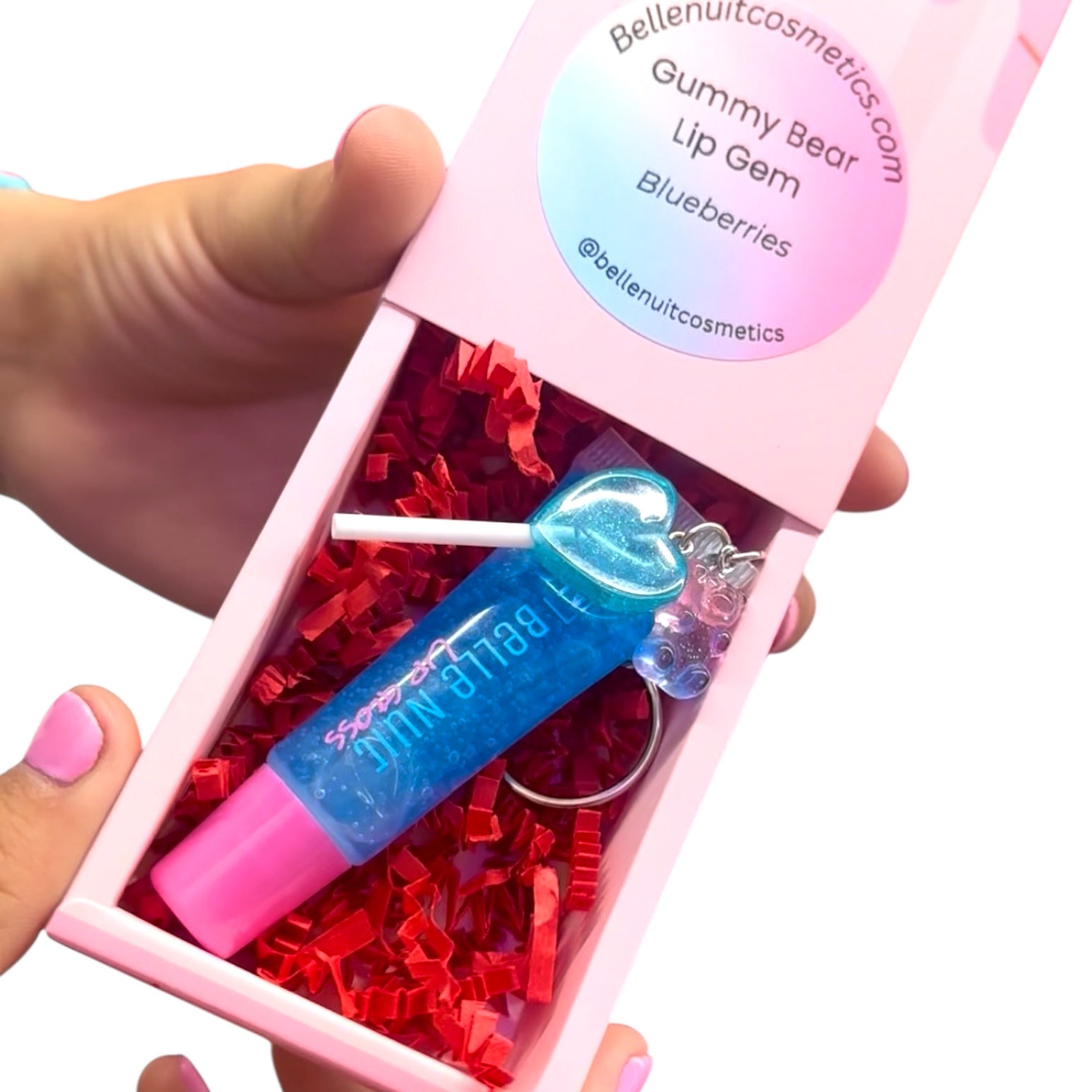 "Features a decorative bear charm attached to the gloss for a playful,, collectible look."